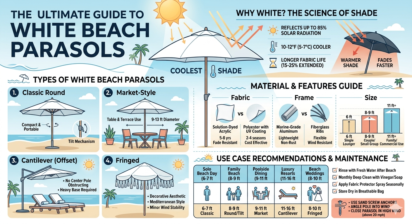 Ní hamháin gur rogha stíle é bán - is é an dath is éifeachtaí ó thaobh teirmeach de do pharasól trá mar go léiríonn dromchlaí ar dhathanna solais iad seachas fuinneamh na gréine a ionsú.