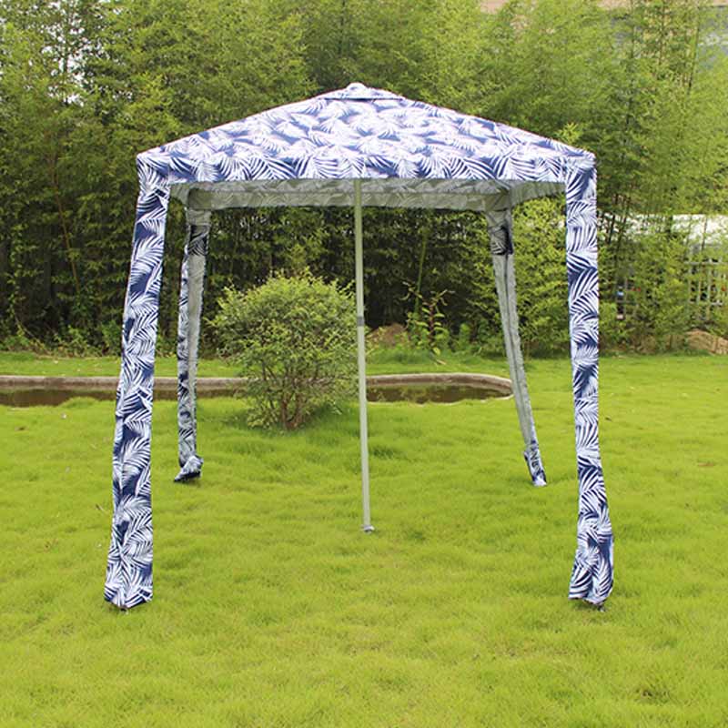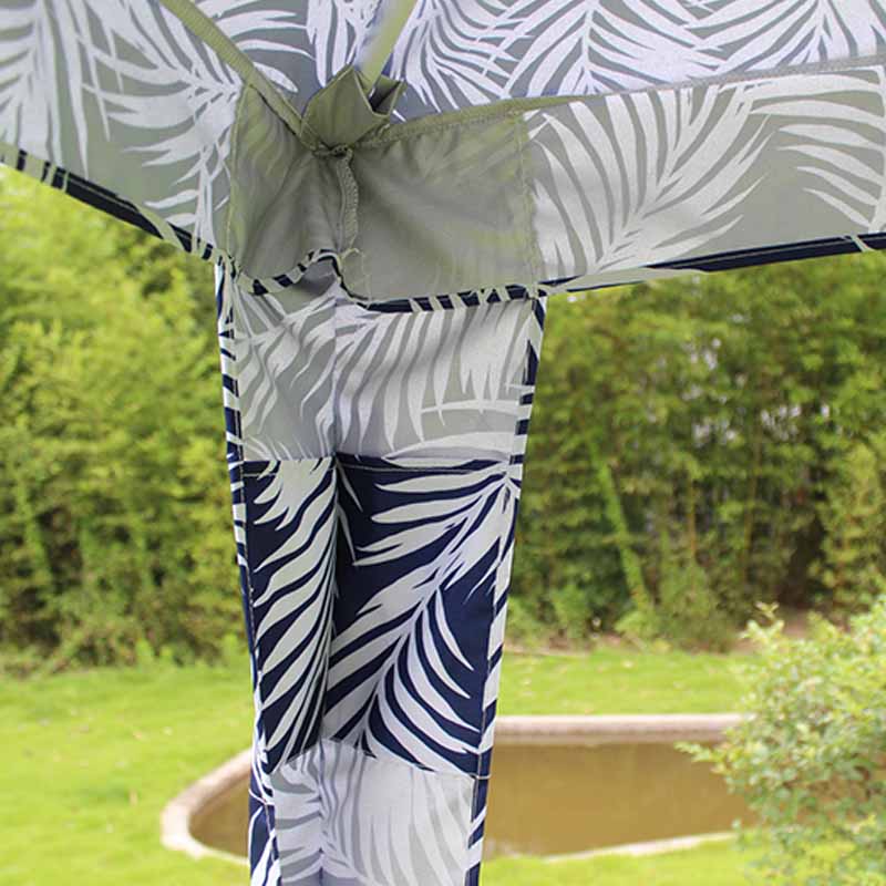 Dearadh patrún úr agus nádúrtha duille pailme, gorm agus bán, ag cur stíl trópaiceach le spás amuigh faoin aer, atá oiriúnach do radhairc éagsúla amuigh faoin aer, is é an fabraic 180g poileistear, éadrom agus buan, le cosaint uiscedhíonach agus UV maith, ag cinntiú gur féidir leis a bheith geal agus nua tar éis úsáid fhadtéarmach.